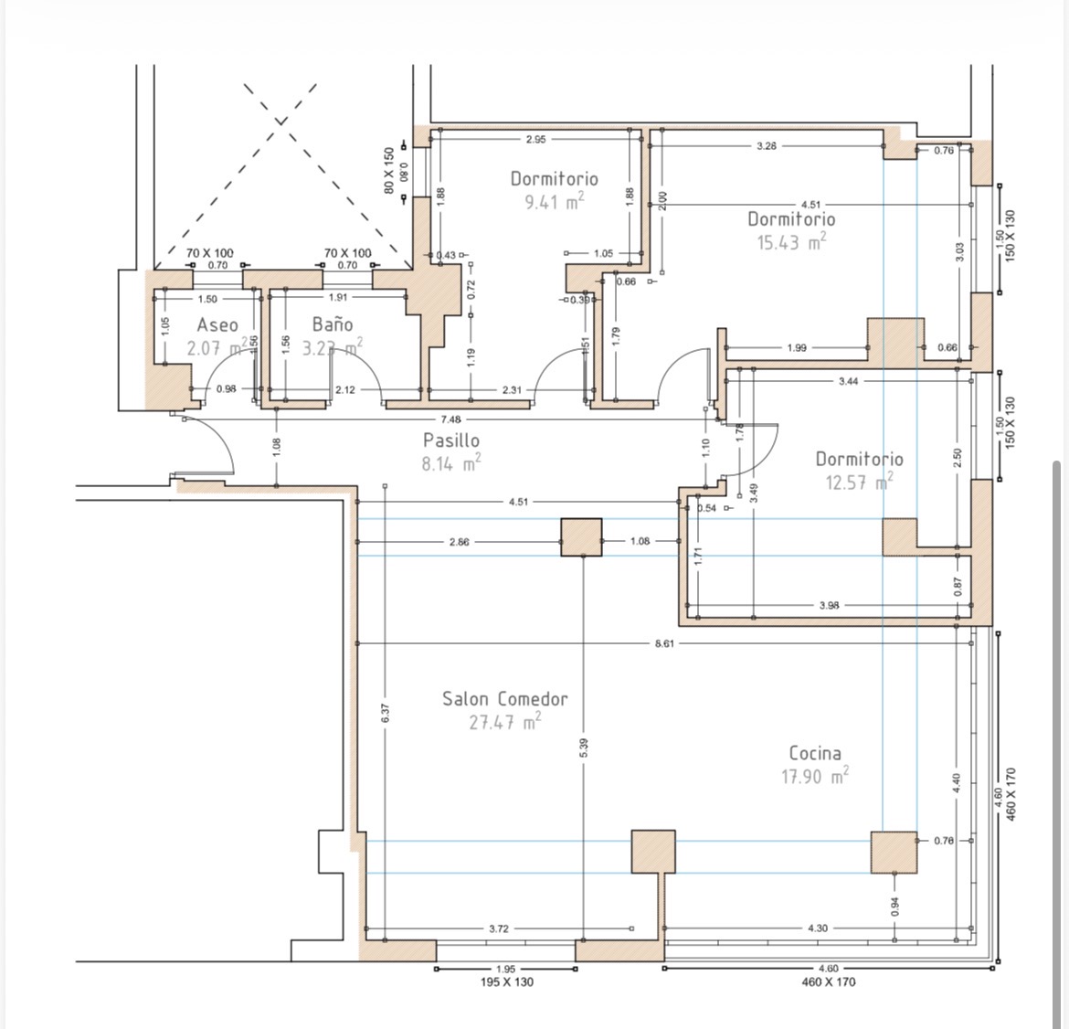 Descripción: Piso recién reformado , nuevo a estrenar, con supuerficie construida 111,82 metros cuadrados. Muy luminoso con cocina  y salón integrados tipo loft muy amplio , tres dormitorios , un baño completo y un aseo. Calefacción central de gasoil y agua caliente por termo. Situado en el centro de la ciudad, esquina a la Calle Recogidas con acceso al metro y autobuses al pie de la calle. Se alquila sin amueblar . La cocina sólo tiene instalado el termo eléctrico y la placa vitrocerámica, Consta de preinstalación de aire acondicionado.